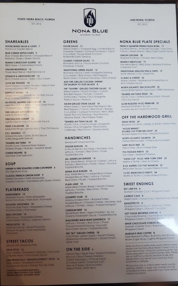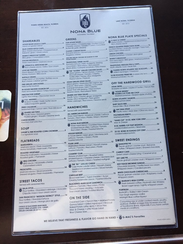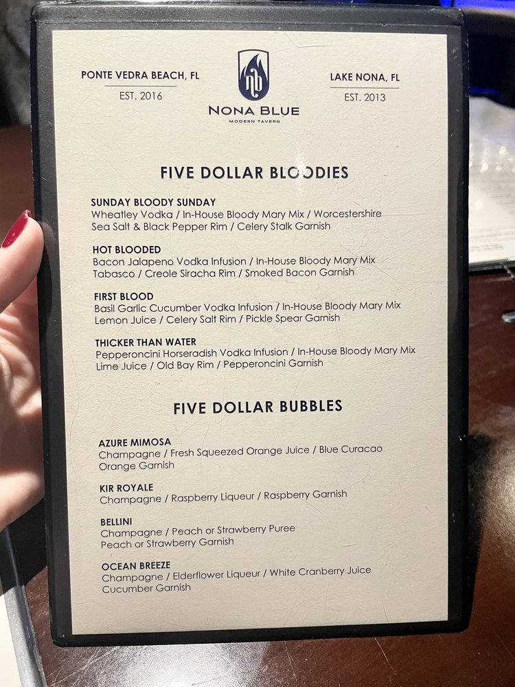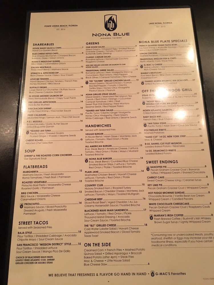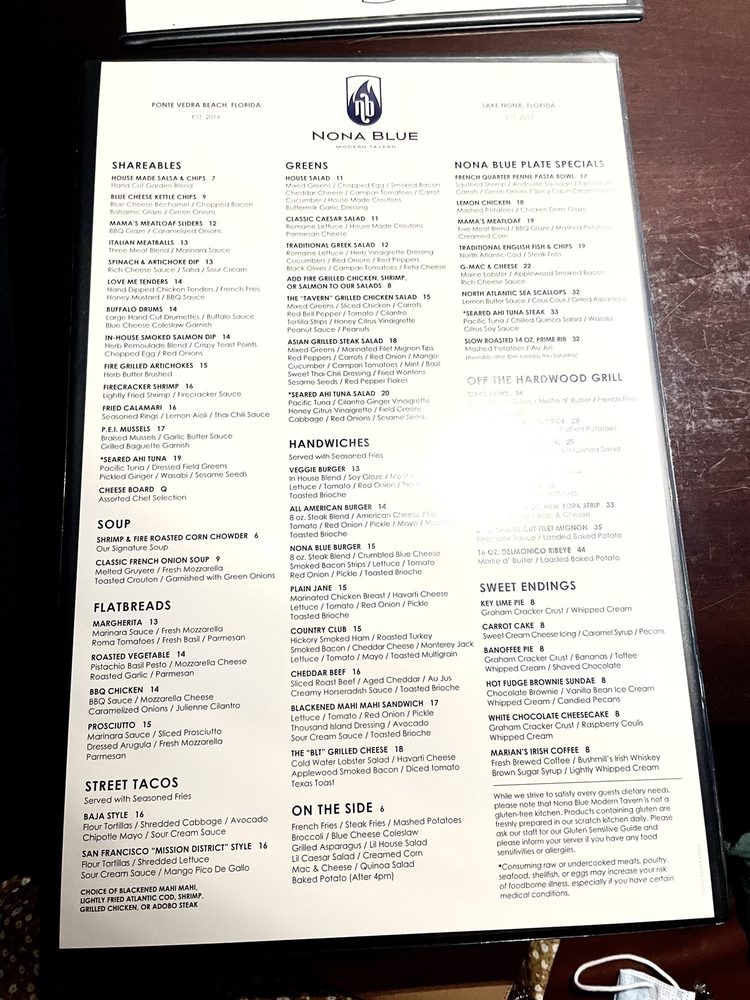 Nona Blue Modern Tavern in Ponte Vedra Beach, Florida, offers a modern American dining experience with a casual yet upscale atmosphere. The menu features a variety of shareable options like Blue Cheese Kettle Chips, Firecracker Shrimp, and Seared Ahi Tuna. Soups, street tacos, and a range of entrees are also available, showcasing dishes like Shrimp & Fire Roasted Corn Chowder and Baja Style Street Tacos. Customers rave about the attentive service and vibrant ambiance, making it a great spot for happy hour or a meal with friends. The outdoor bar area is a standout feature, and the extensive drink menu includes signature cocktails and craft beers. Overall, Nona Blue Modern Tavern offers a delicious dining experience with a diverse menu and welcoming atmosphere.